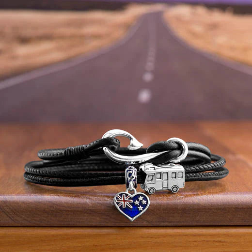 The Safe Travel Wrap Bracelet features a sterling silver safe travel hook on soft leather, promising protection and safety as you explore the world. Designed to wrap around your wrist twice, it loops securely onto the fish hook for a meaningful and stylish finish.