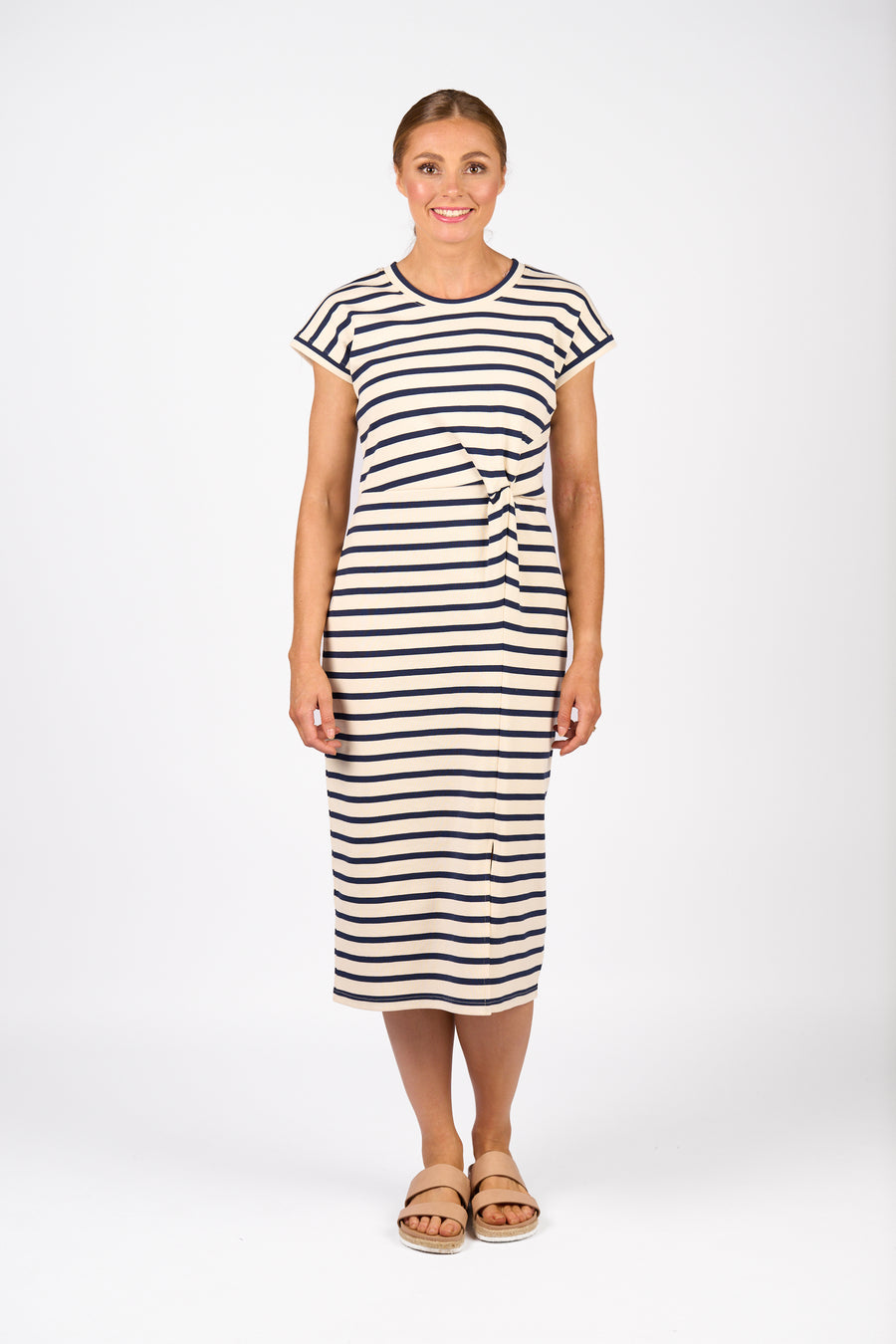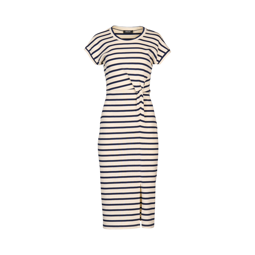 The Knewe Parker Dress is a versatile and flattering piece crafted from soft stretch cotton knit fabric — perfect for effortless everyday style. Designed with a relaxed drop shoulder and short sleeves, this dress features a twist detail at the waist, shaping the silhouette while maintaining comfort. The side front split ensures ease of movement, making it ideal for both casual and polished looks.