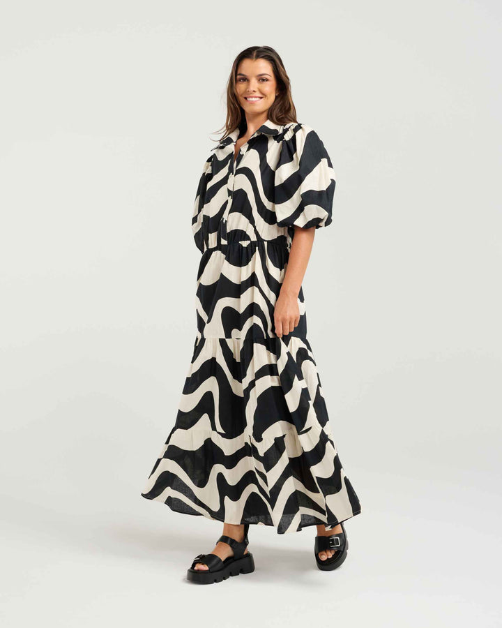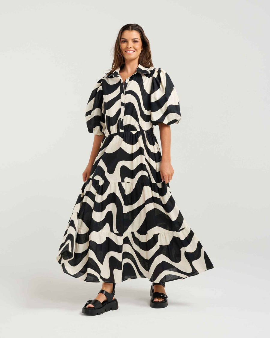 Make a statement with the NMBR Rose Amber Dress, designed in a bold oversized black and cream print. Crafted from a breathable cotton–linen blend, this midi dress features a relaxed silhouette with a softly gathered waist that creates subtle shaping while keeping the fit effortless and comfortable.