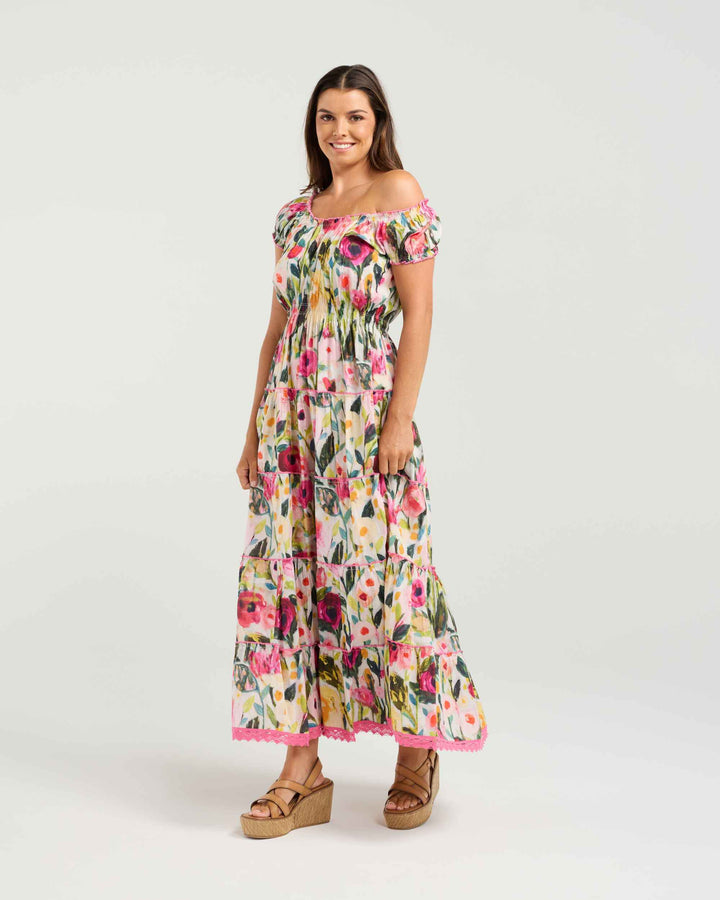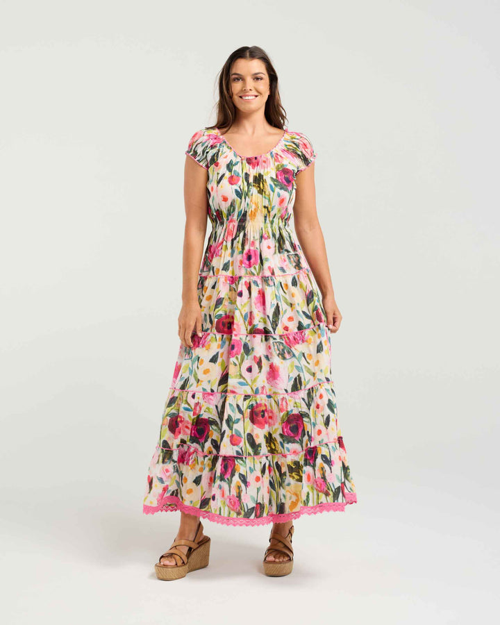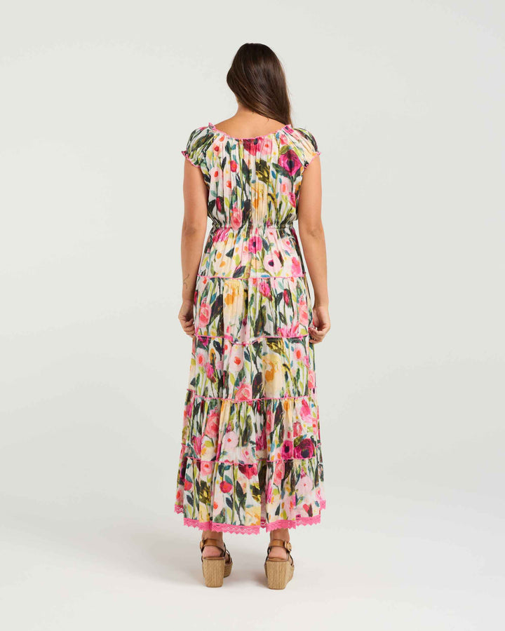 The NMBR Rose Jazz Maxi Dress is a flowy, feminine piece that captures romantic charm with its painterly floral print in soft pink, green, and yellow hues. Crafted from 100% cotton, this breathable maxi dress is designed with delicate flutter sleeves, a tiered skirt, and scalloped lace trim for a graceful finish.