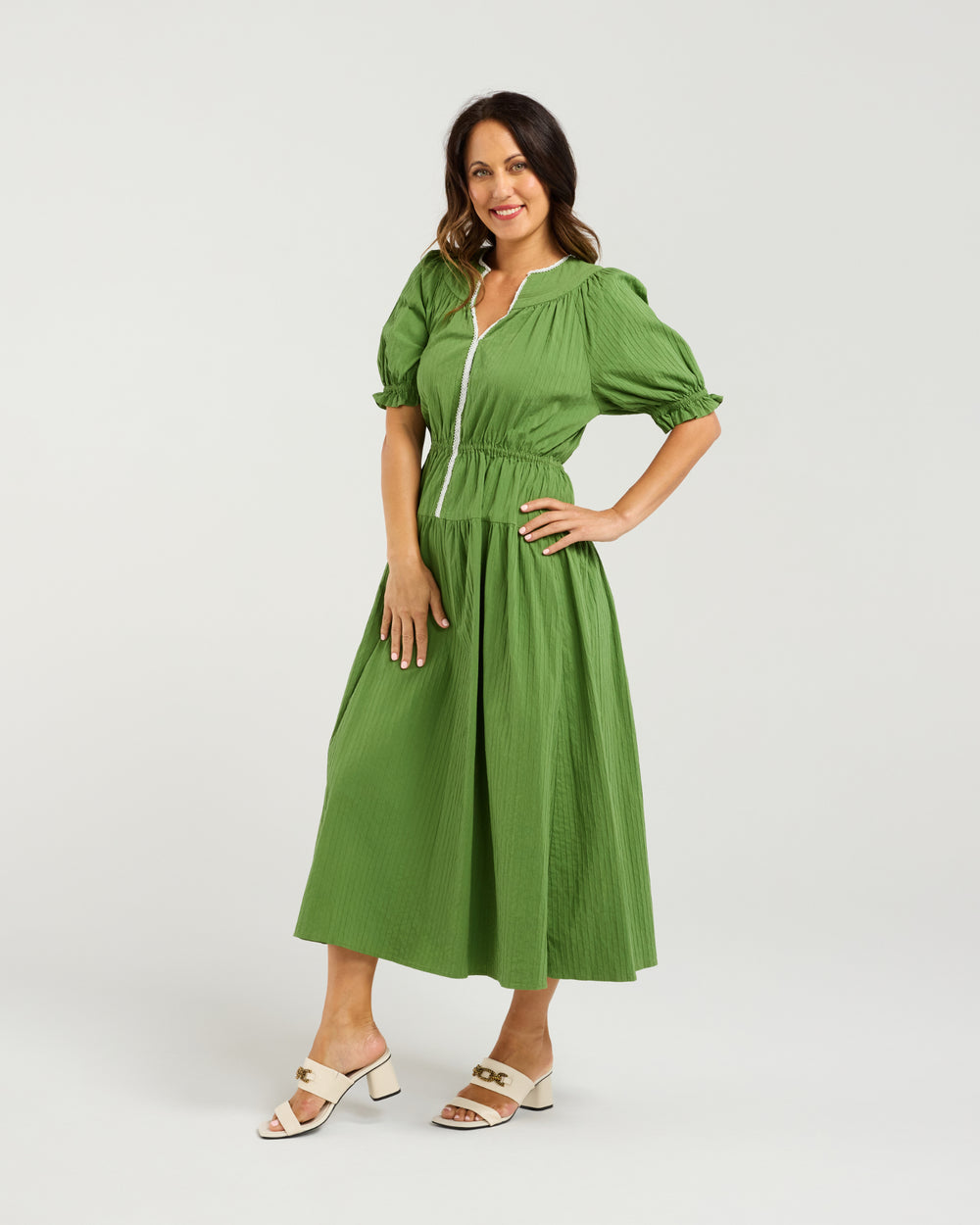 Green dress is defined by its delicate detailing and flattering shape.