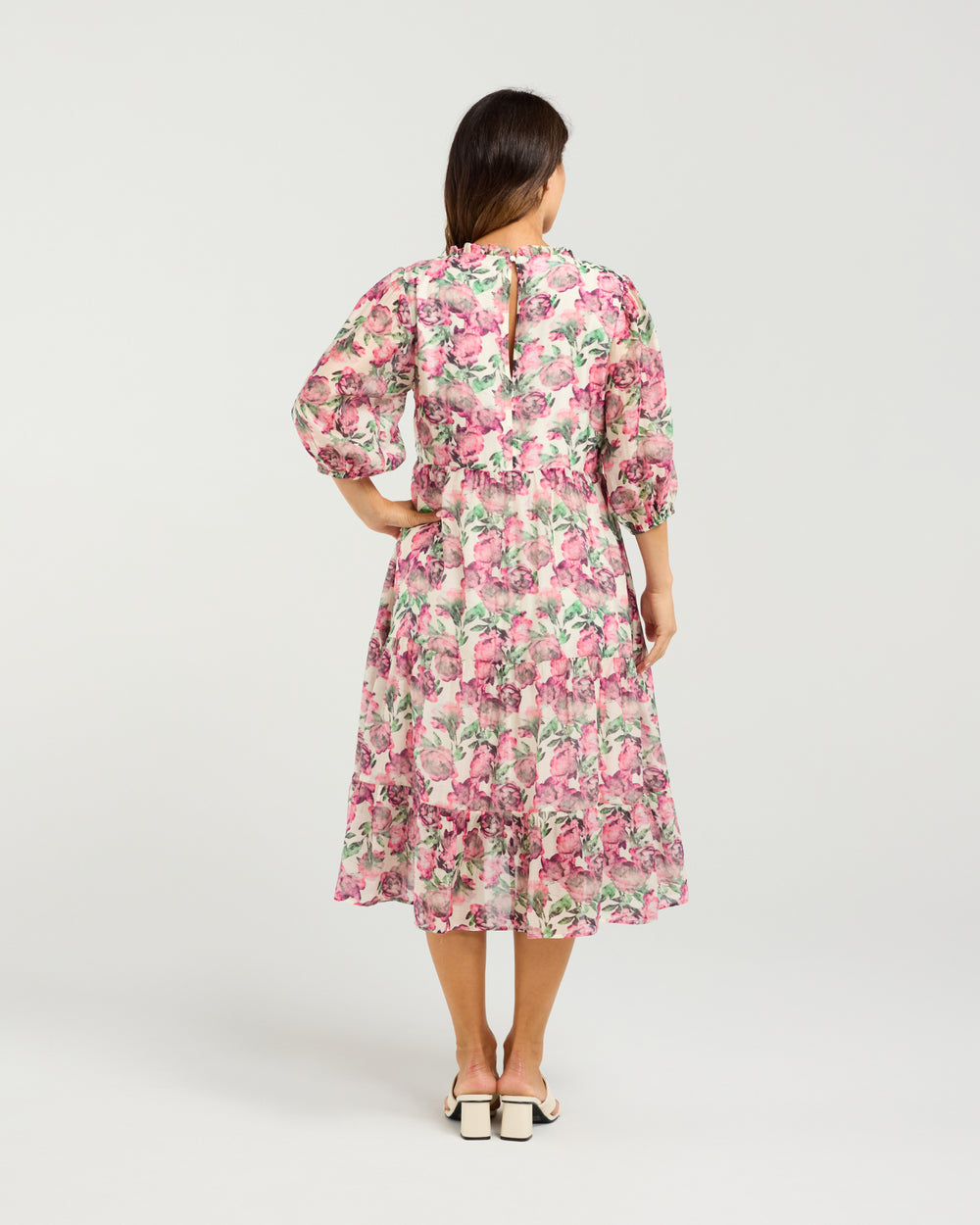 The 3/4 sleeves offer easy elegance, while a delicate frill along the neckline adds a charming, vintage-inspired detail.
