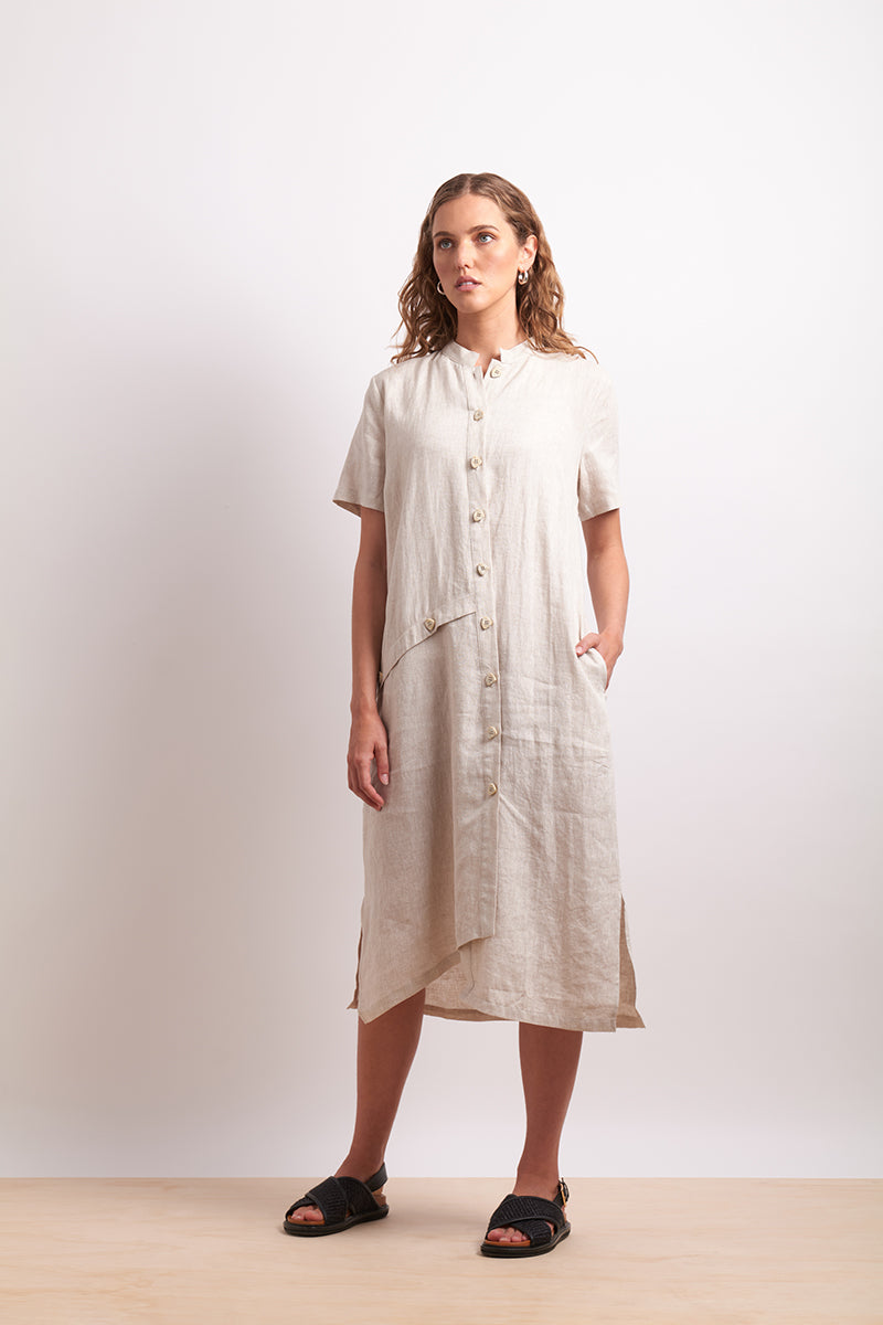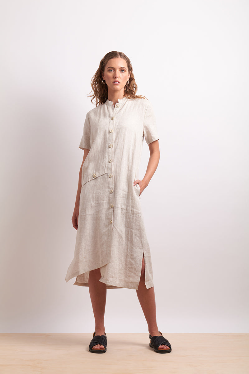 Tailored to flatter from every angle. The Divine Angles Dress is a 100% linen midi dress designed with sculptural panelling, side splits, and tonal button detailing. It has a mandarin colour and pockets and can be worn as a dress or open as a duster. A sleek modern silhouette celebrating understated design. Designed in Christchurch, New Zealand.