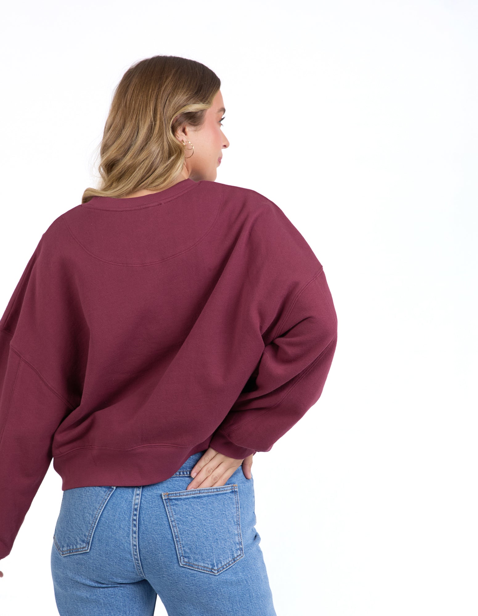 Featuring eye-catching front applique artwork and a soft round neckline, the Foxwood Sunday Crew in Berry is all about that relaxed, easy style.