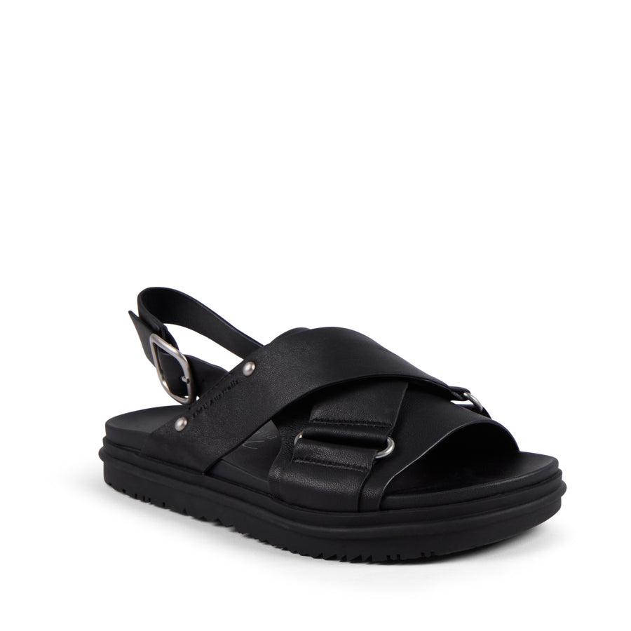 Classic with a twist, this leather crossover sandal features a secure back strap with an adjustable buckle and subtle metal accents for everyday ease.