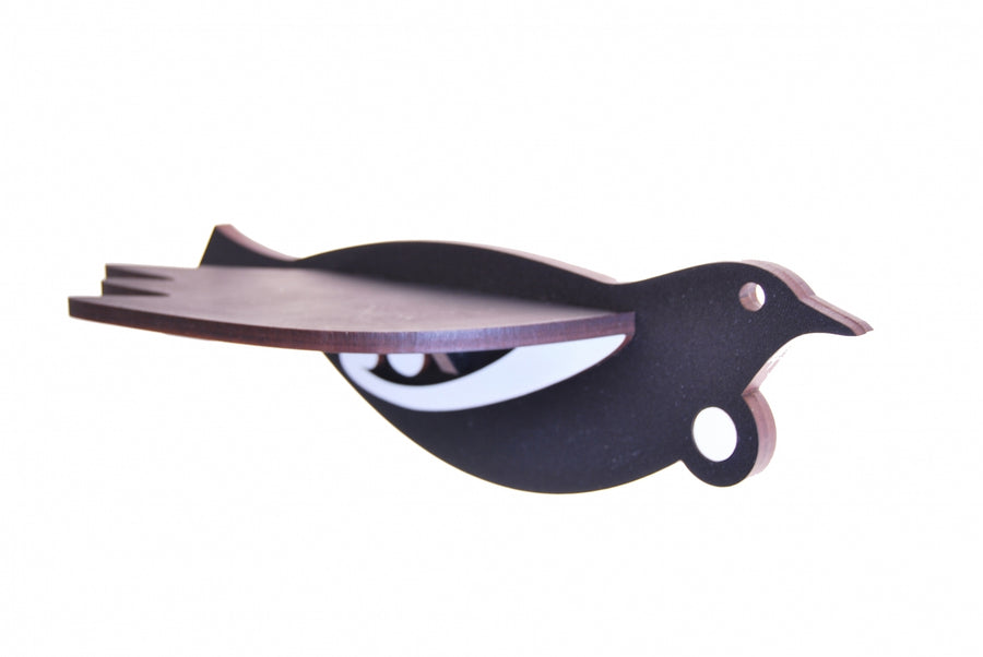 A charming little shelf featuring a black vinyl board Tūī with striking white Koru detail. Perfect for perching small keepsakes or simply enjoying as decorative wall art.