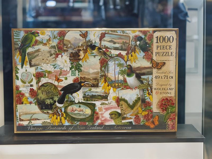 Decoupaged from a mix of Tanya Wolfkamp’s personal collection of early coloured lithograph postcards and historic 19th-century scenic prints of New Zealand, this 1000-piece puzzle beautifully showcases some of Aotearoa’s most cherished native flora and fauna. Rich in detail and colour, it features a vibrant array of native flowers, moths, and butterflies.