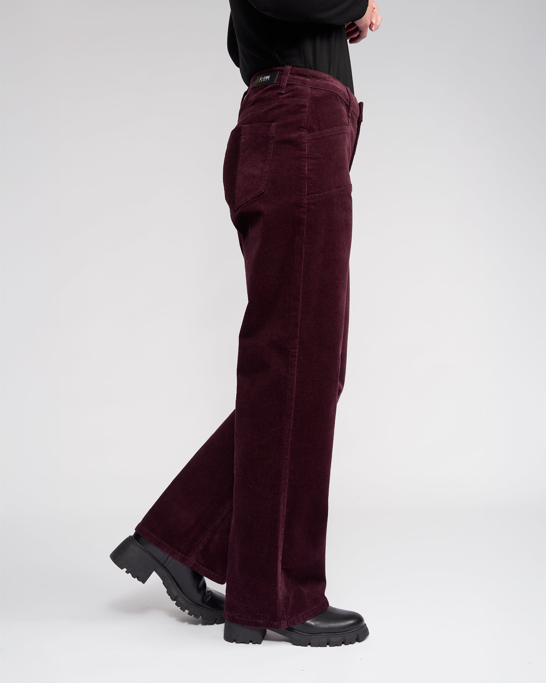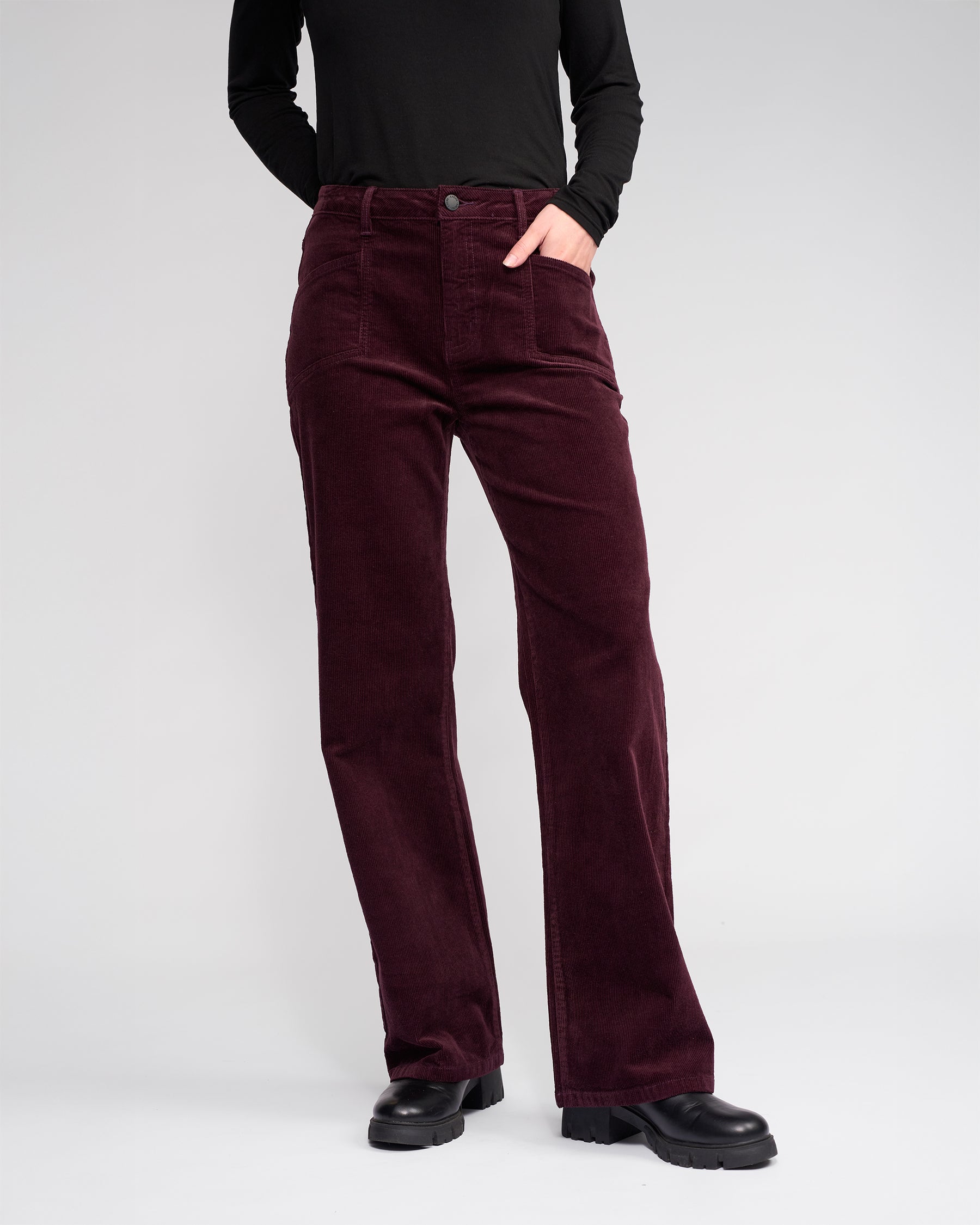 Full-length wide-leg pant in corduroy, designed in our Raisin colour — a rich dark purple-red tone.