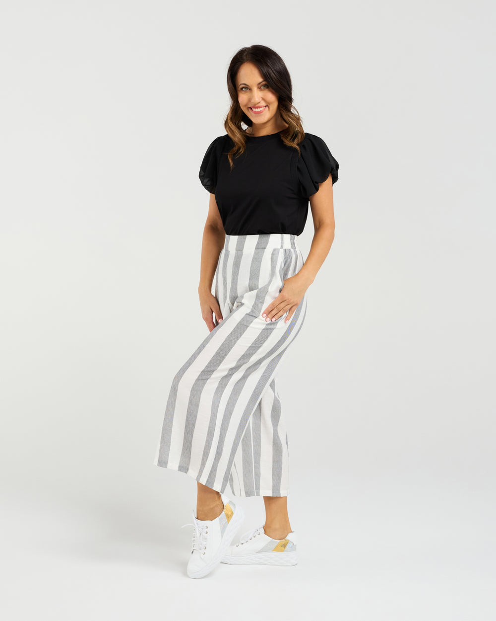 Wide-leg three-quarter pants with an elasticated waistband, offering an elegant and comfortable fit.