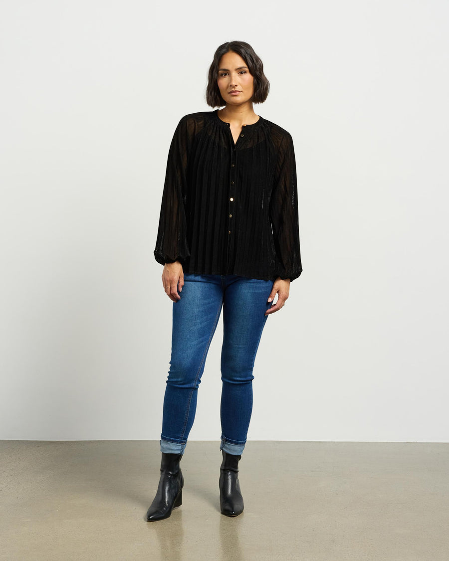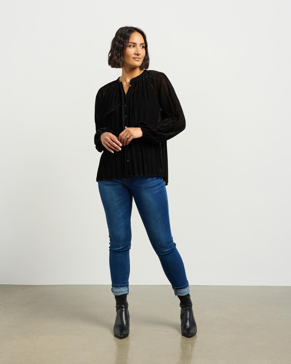 This button-through pleated shirt is crafted from luxurious velvet mesh, offering a rich texture and subtle sheen that exudes sophistication.