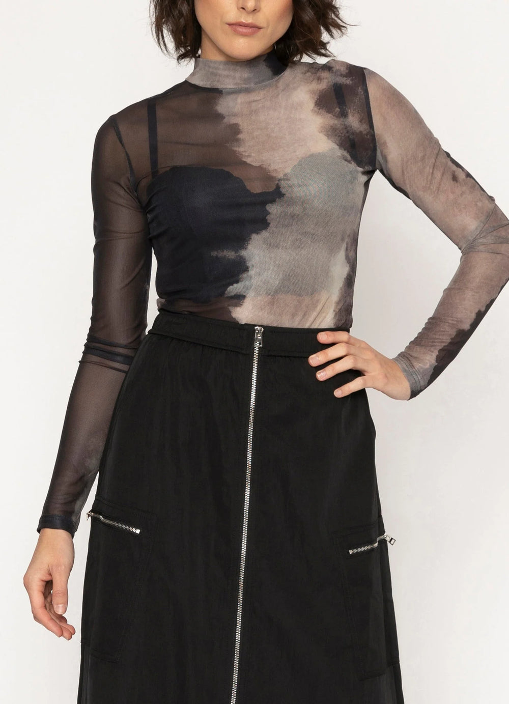 This high-neck sheer mesh top with long sleeves is both chic and sexy. Its fitted design adds a touch of sophistication to any outfit. Perfect for a night out or a casual day look.