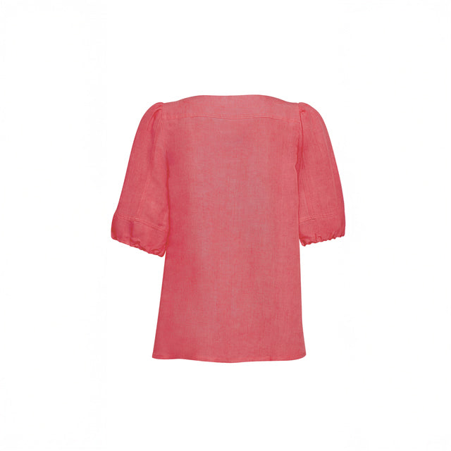 Relaxed tee with a V-neckline, featuring lightly gathered puffed sleeves with soft elasticated sleeve cuffs.