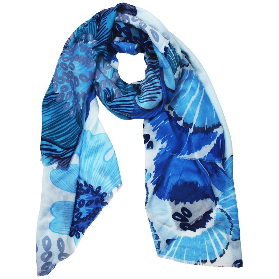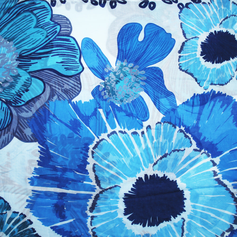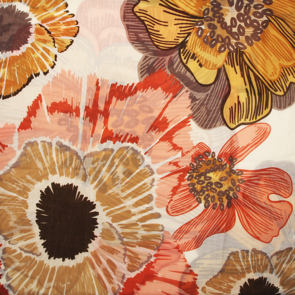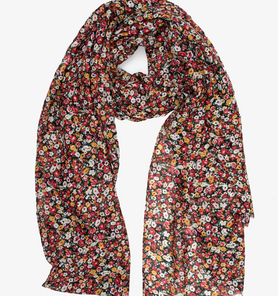 Black base scarf with a multi coloured, small Kalanchoe floral design.