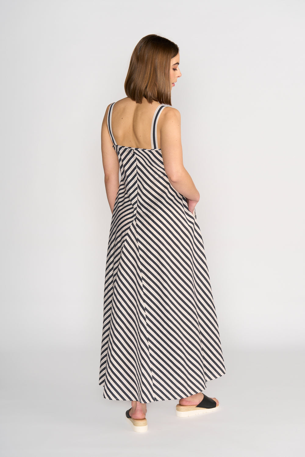 The Gala Dress is a full-length, floaty summer dress featuring a chic striped print for an effortlessly feminine look. Crafted from a lightweight cotton-nylon blend with a soft cotton lining, it’s shaped through the bust and waist before flowing into a relaxed, breezy skirt. Perfect for warm days, holidays, or casual summer events, this striped maxi dress combines comfort and style with ease.