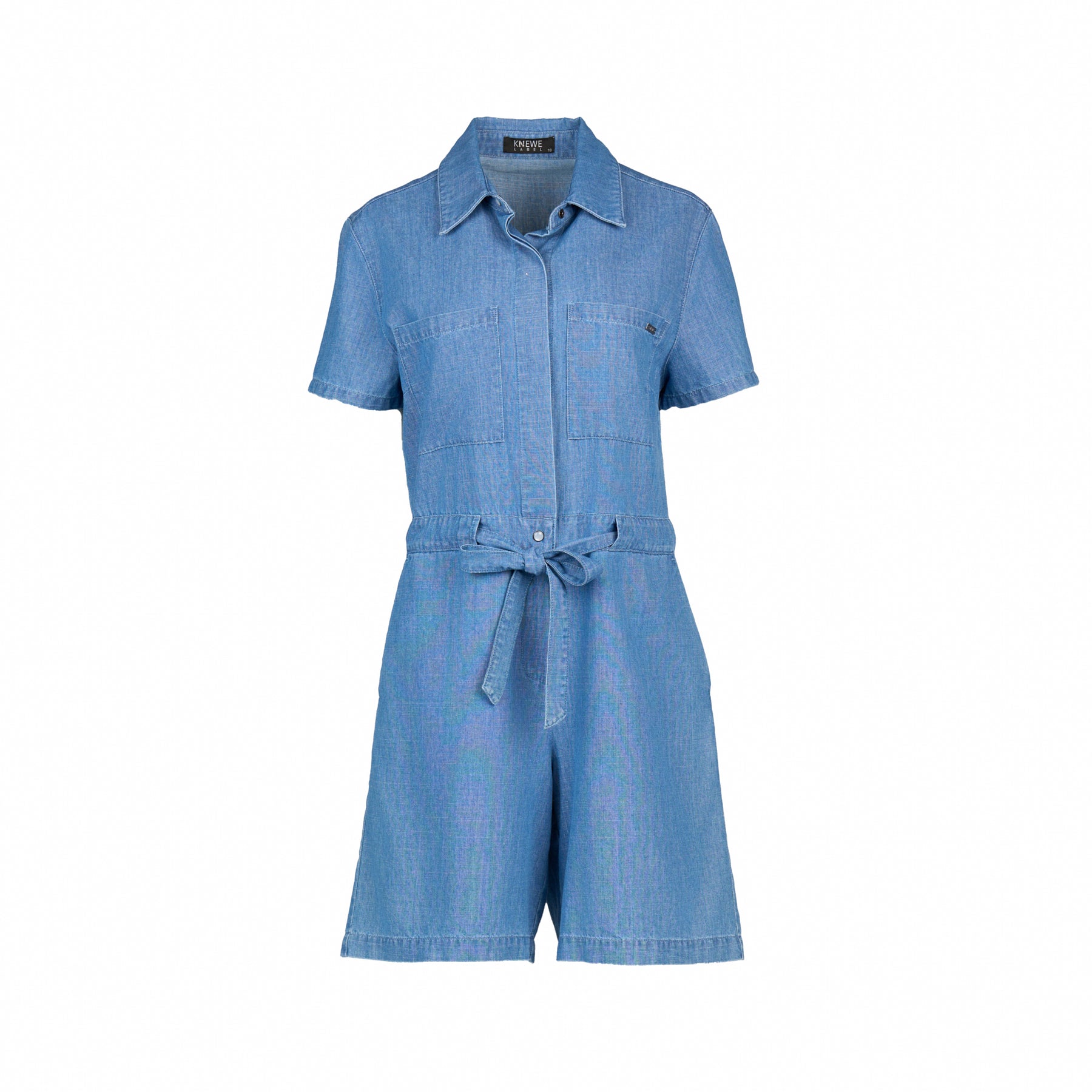 Crafted from lightweight cotton with a denim look, it features a collared neckline, short sleeves, and a tie waist to shape the silhouette.