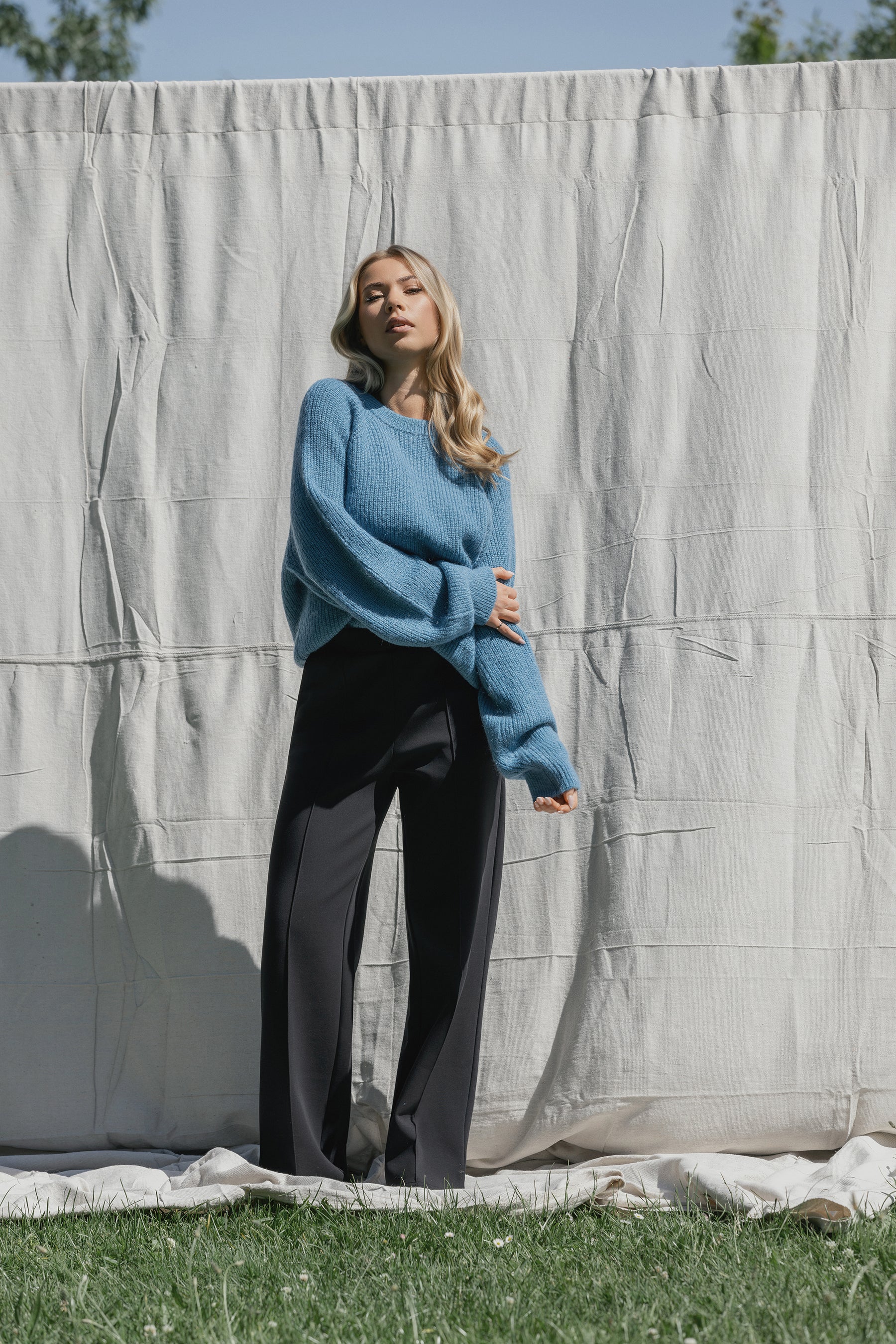 | Oversized knit sweater in Ultramarine, a vibrant blue, crafted from a soft blend including mohair and wool for warmth and texture. Featuring raglan balloon sleeves and a round neckline, this sweater offers a relaxed, statement making silhouette with a cosy, luxurious feel. |