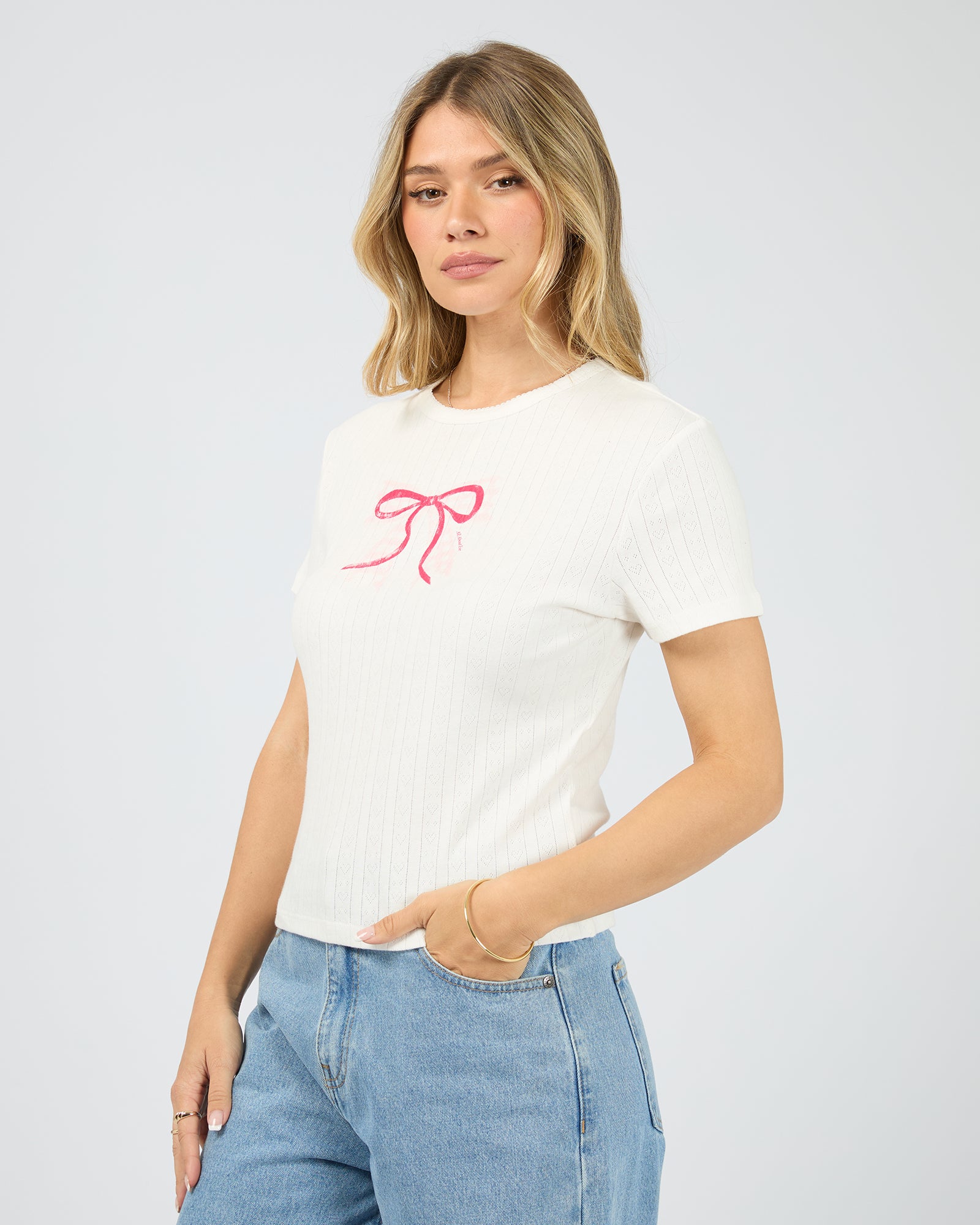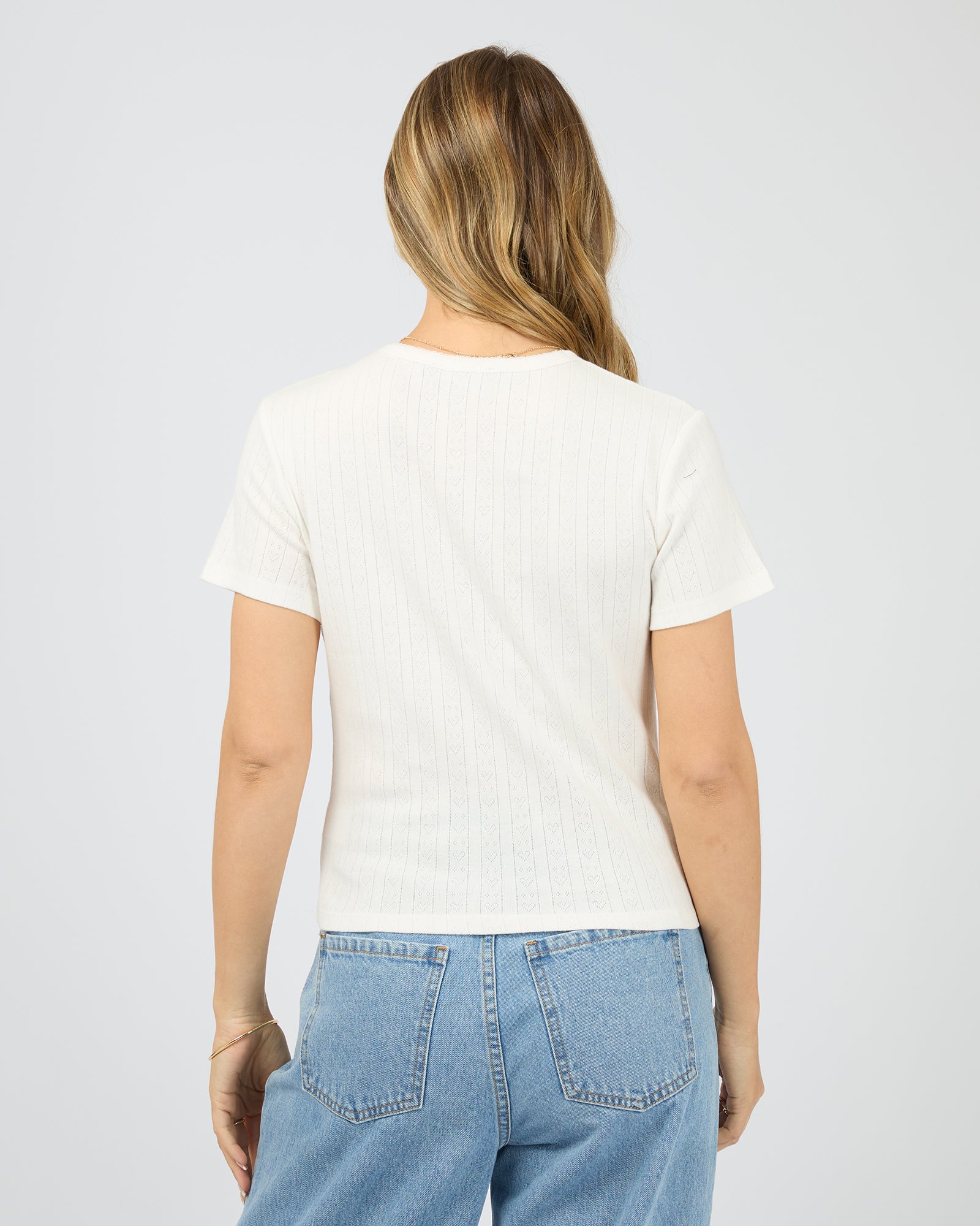 The Postal Baby Tee is a sweet staple for your spring wardrobe, crafted from soft cotton pointelle in vintage white.
